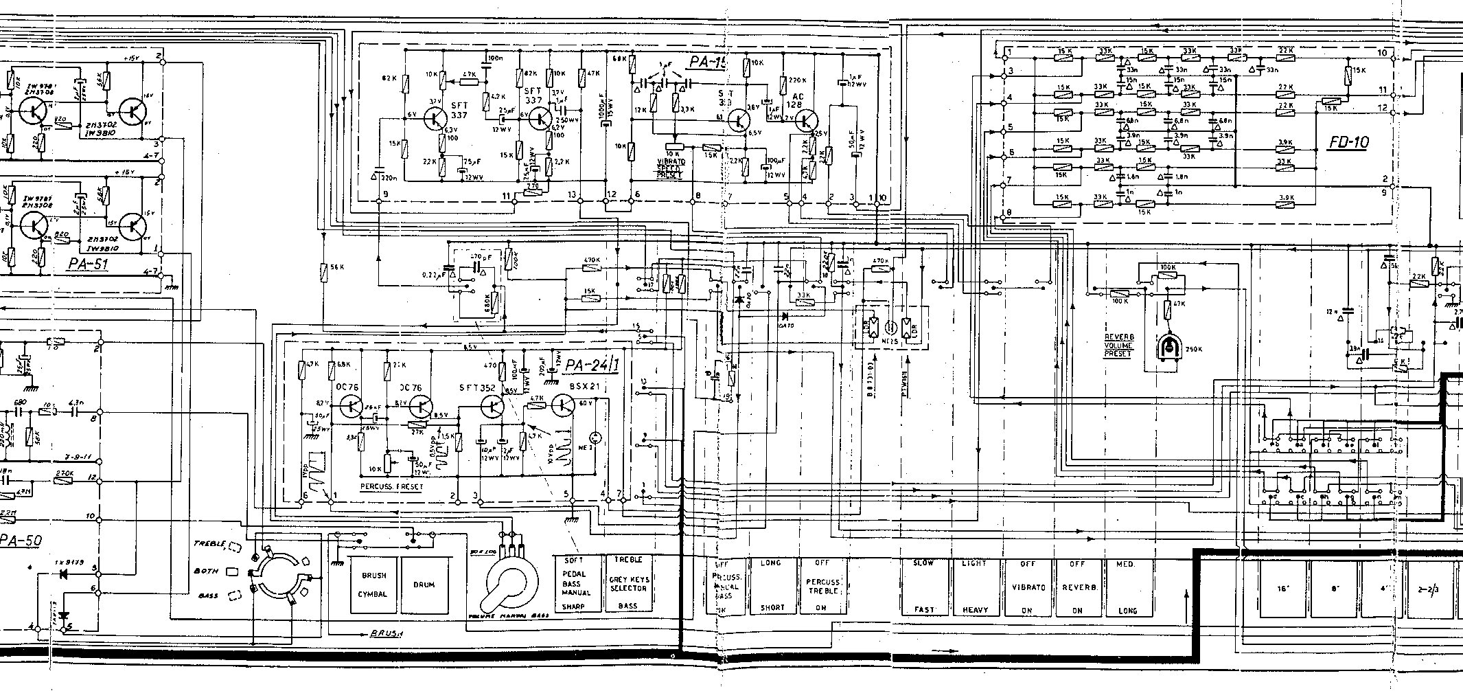 All for you, here is the Farfisa Matador schematic for your viewing and tweaking pleasure. This also includes the ridiculously awesome inner workings of the vibrato, percussion, tone generators, and much, much more!