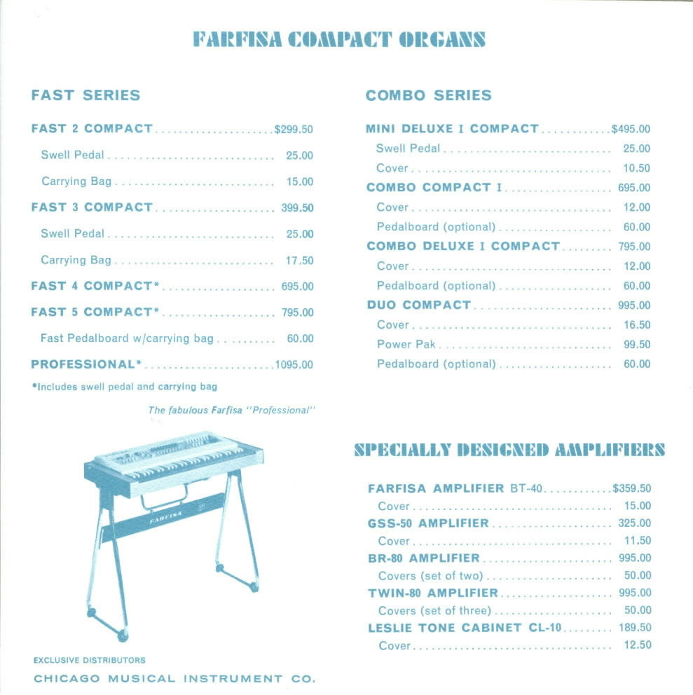 The swinging rhythm and driving beat of today’s music make the new electronic COMBO COMPACT a “natural” for young groups who play this modern sound. Its unique Multi-Tone Booster gives tremendous attack and “edge” by boosting the upper frequencies, highly desirable in arrangements popular with many young groups. The COMBO COMPACT is the modern sound for which they are looking!