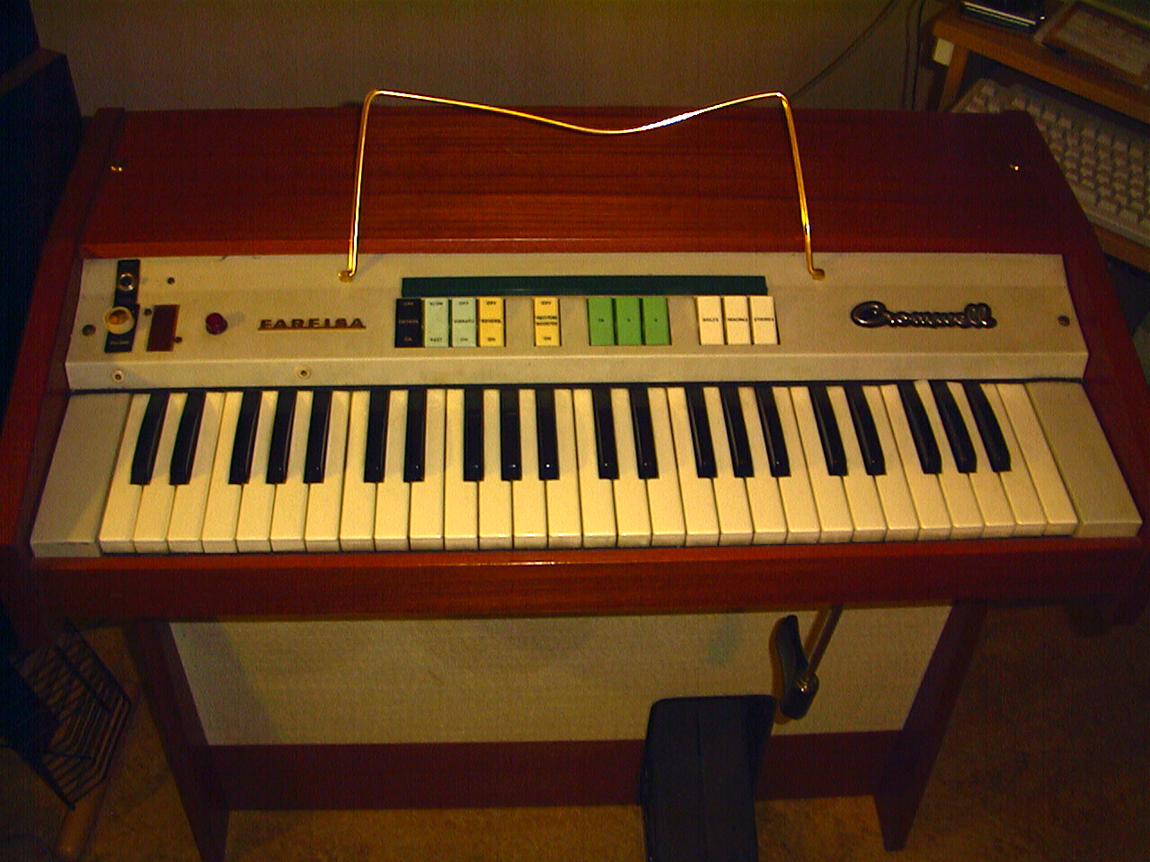 Check out the one and only (no, seriously, there is probably just one of these) Farfisa Cromwell. Or is it the Farfisa Foyer like it says in the last picture? In an incredible engineering feat, someone took a Mini Compact Deluxe and mounted it into a wood console with 2 – 10″ Speakers, and a sweet built in volume pedal. In addition to the Multi-Tone Booster, it looks like someone snuck in an extra tab for a Chorus effect!