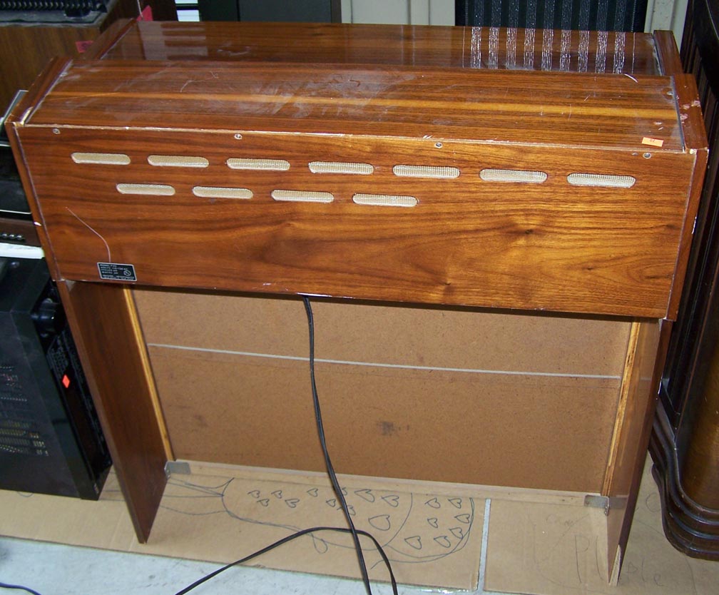 I saw the little thumbnail image for this guy and thought to myself, what could be in that box underneath the organ? Well, as you can see from the second pic, nothing! Here is what must be the super deluxe version of the reed organ known as the Pianorgan, mounted on some very nice looking mahogany, lined with tweed to hide the non-existent (and non-needed) speakers!