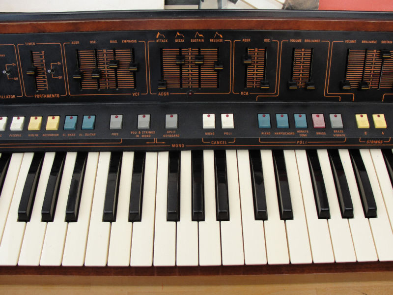 Built from 1979 to 1981, this thing cost around £900 new (this model was bought in 1982, I think I’ve got the receipt somewhere!) which put it in competition with some pretty serious hardware. It also explains why it’s so rare. It was in production until just before MIDI, the Prophet 600 and Juno 106 came along, but looks like it’s from an entirely different era. The whole keyboard and front panel are angled slightly forwards, as it was designed to sit on top of a combo organ or piano (although a snazzy stand was also available as you’ll see from the promotional literature included).