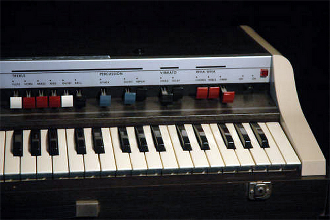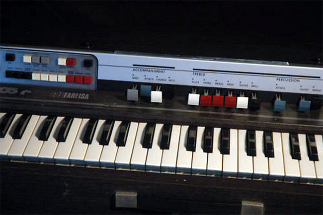 Description: Vintage “Pianorgan” made in Italy, by Farfisa. I belive this one was imported to the US by RCA Victor Canada, but I am not sure. These are called “wind organs” because they play music by wind (generated by an electric motor) blowing through the reeds. They produce an accordian-like sound.