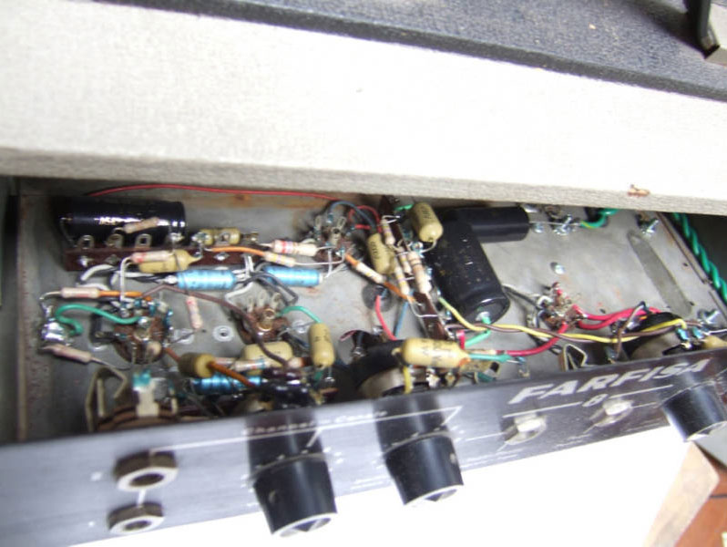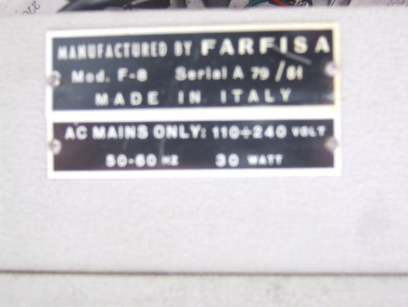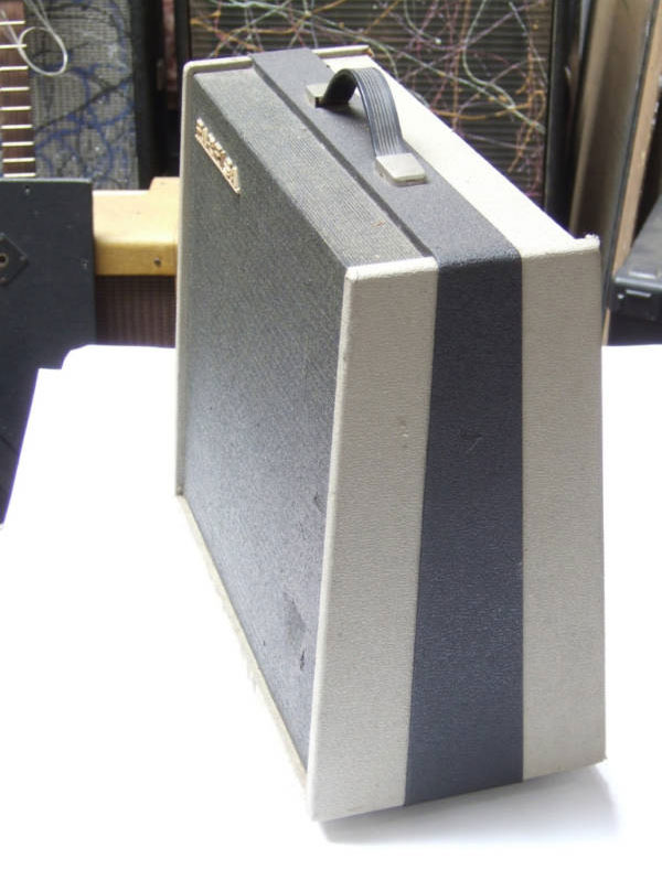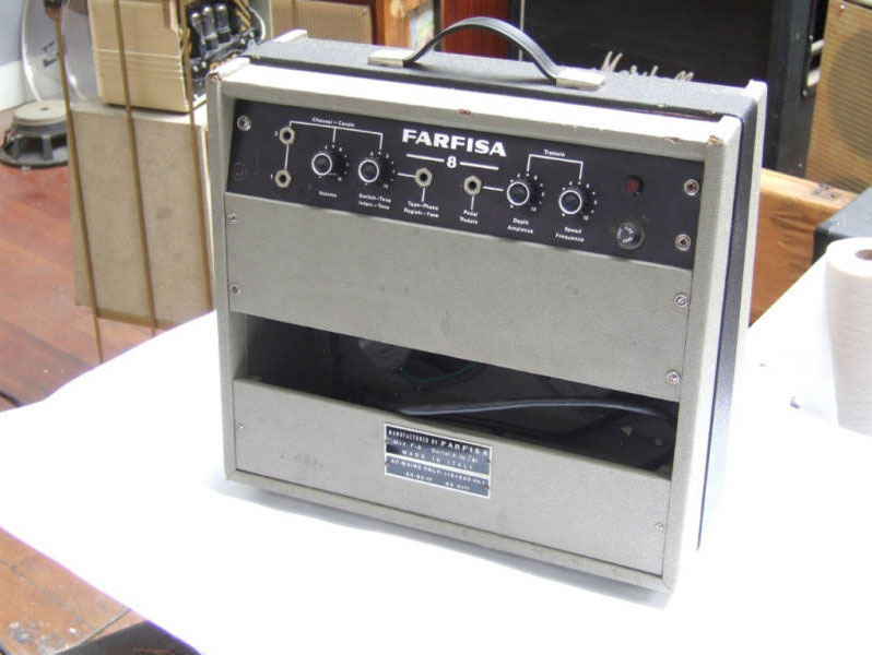 This is an extremely rare Farfisa 8, 8 watt tube practice amp for guitar, ez81 rectifier, single el84 power tube, and two ecc83 preamp tubes, has volume, tone, and superb vibrato. Speakers are two 6″ Quam alnicos (not original). The amp has been totally gone through by one of Portland’s best tube techs, and has new filter caps. He also put in a new, custom wound, power transformer because the last one was non original and not a good match for this amp. The sound is a warm tube sound, fairly clean with single coils, more breakup with humbuckers. Just on its own, it is a fairly unremarkable amp, but once you put a boost in front of it, it becomes a wailing tone monster. I used a Zendrive with it and got great sounds. As I say, the vibrato is also very clear and cool. As you can see, there are some tears in the speaker cloth and some scuffs, but over all it looks quite good.